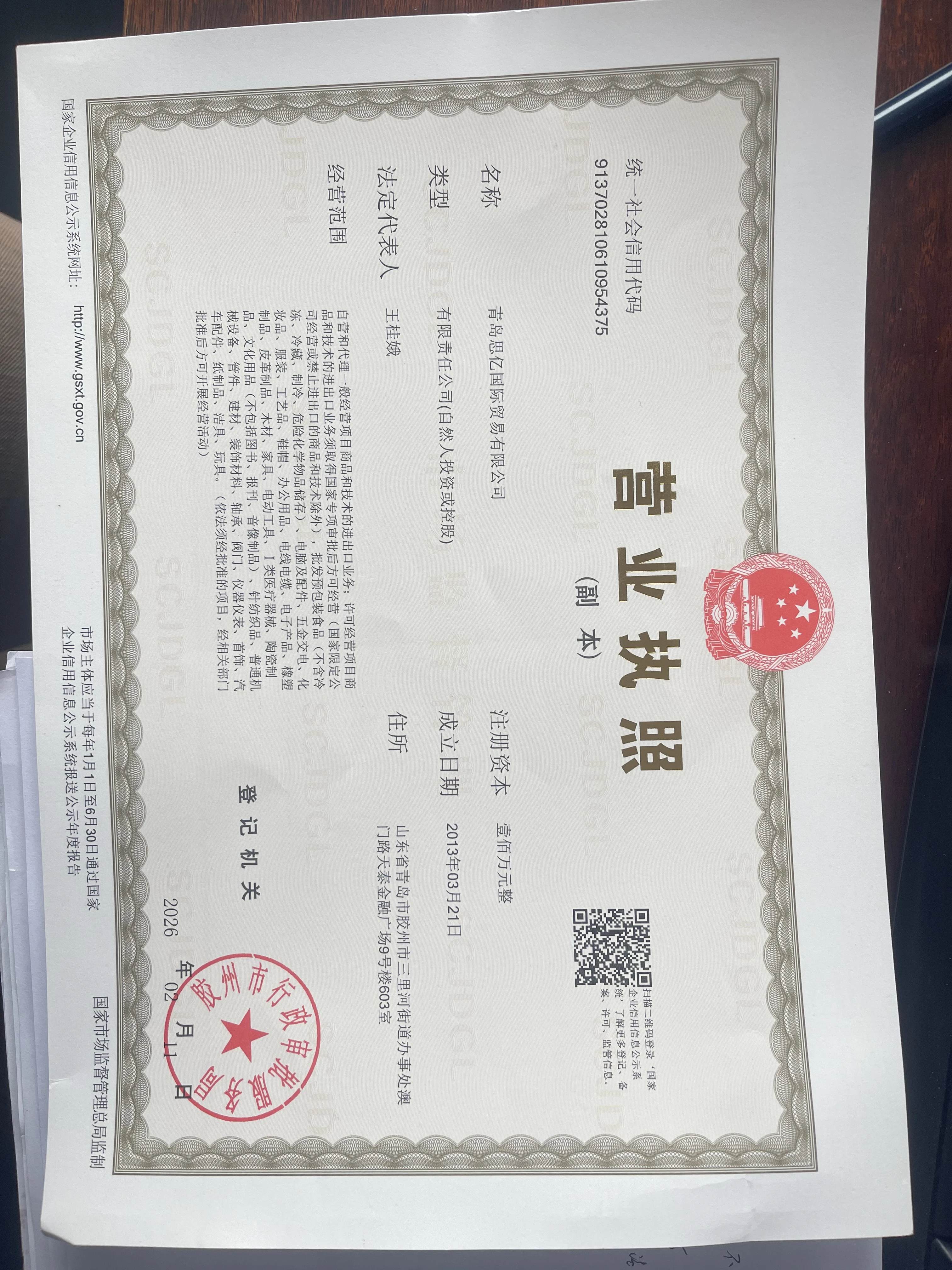 Registered address : Room 603, Building 9, Tiantai Financial Plaza, Macao Road, Sanlihe Sub-District Office, Jiaozhou city, Qingdao City, Shandong Province Qingdao Shandong China